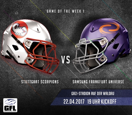 Die 39. Saison der German Football League (GFL) startet: Im Season Opener stehen sich im Stuttgarter GazI-Stadion auf der Waldau am 22. April ab 19 Uhr die Stuttgart Scorpions und Samsung Frankfurt Universe gegenüber. Ebenfalls am Samstag spielen in ersten vorgezogenen Spielen auch die Hamburg Huskies gegen die Berlin Adler und die Munich Cowboys gegen die Saarland Hurricanes.