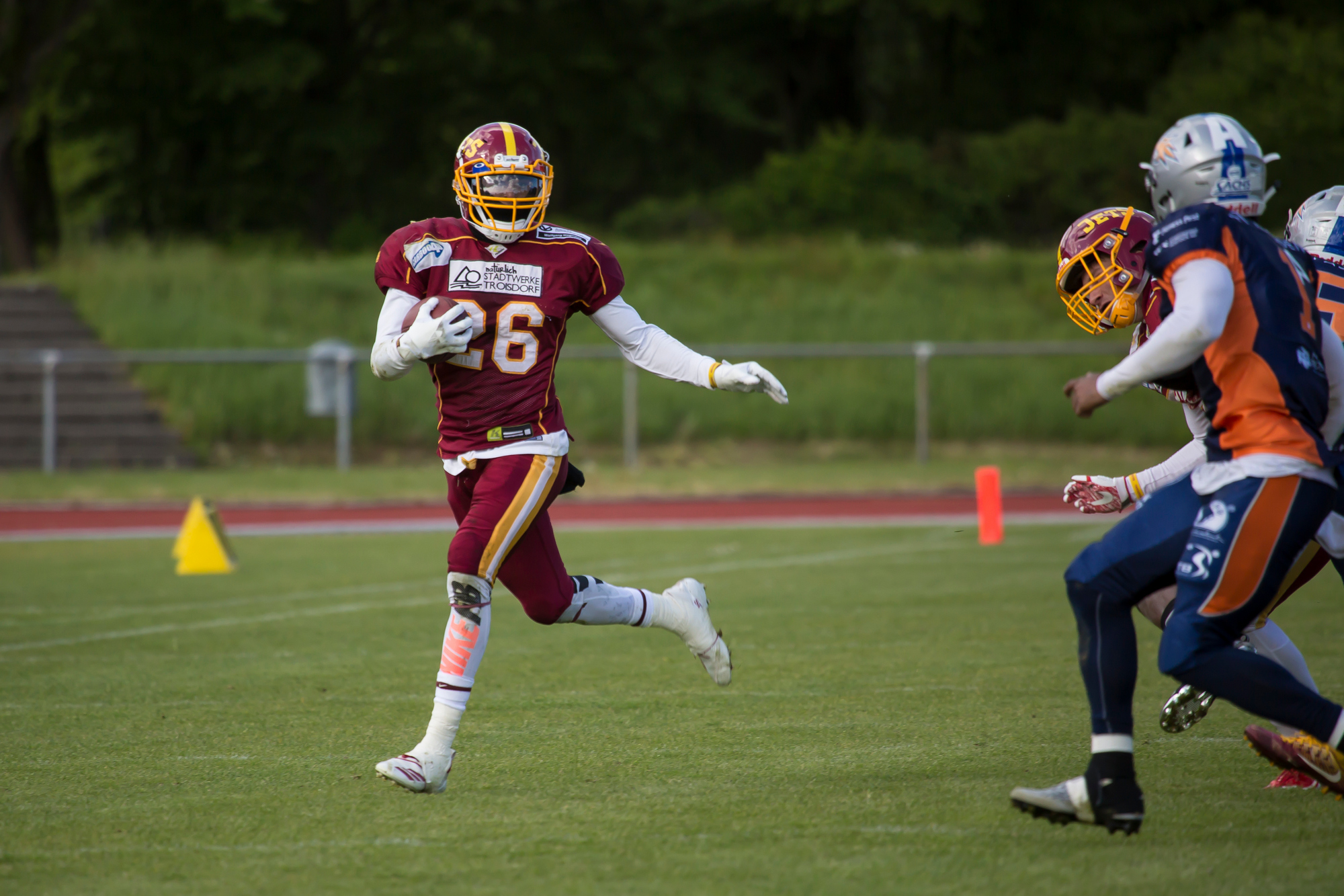 35 Sekunden vor dem Ende der 1. Halbzeit spielten die Gäste dann ihre Zweitliga-Erfahrung aus und holten sich die Führung mit einem Pass von Quarterback Christopher Jeffrey auf Wide Receiver Ruben de Ruyter zurück (14:7, PAT Rohde).
