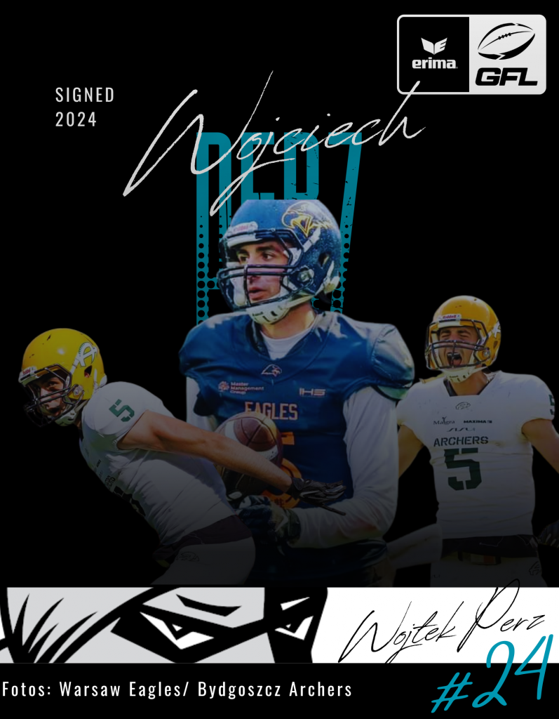 Polnischer Nationalspieler Wojciech Perz wechselt 2024 nach Berlin, Charlottenburg. Der 25 jährige Safety/ Cornerback aus Polen kommt von den Warsaw Eagles wo er 2023 seine Saison verbracht hat. Mit seinen 1,94 m ist er für einen DB sehr groß, was natürlich für die Passverteidigung absolut von Vorteil ist. Gestartet ist seine Footballlaufbahn allerdings in seiner […]