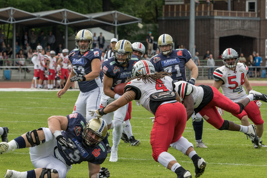 Die Dresden Monarchs haben sich nach zwei Niederlagen mit einem deutlichen Sieg zurück gemeldet. Bei den Hamburg Huskies gewannen die Sachsen am Samstag verdient mit 18:68 (06:16/6:14/6:16/0:22). Es war über weite Strecken das erwartete Spiel. Auf der einen Seite bisher sieg- und glücklose Hamburger. Ein vor der Saison arg geschwächtes Team, welches um seine Form und erste Punkte ringt. Daraus wurde auch […]