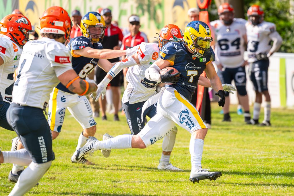 Kirchdorf/Hildesheim. In Kirchdorf brannte nicht nur die Luft, auch die Invaders fackelten ein Feuerwerk ab. Nach einer dominanten ersten Hälfte war die Interconference-Partie zwischen Hildesheim und den Wildcats bereits gelaufen. Nach dem zwischenzeitlichen 35:0 nach 24 gespielten Minuten, setzen sich die Invaders am Ende deutlich mit 56:7 durch. Gleich im ersten Spielzug zeigten die Invaders, […]