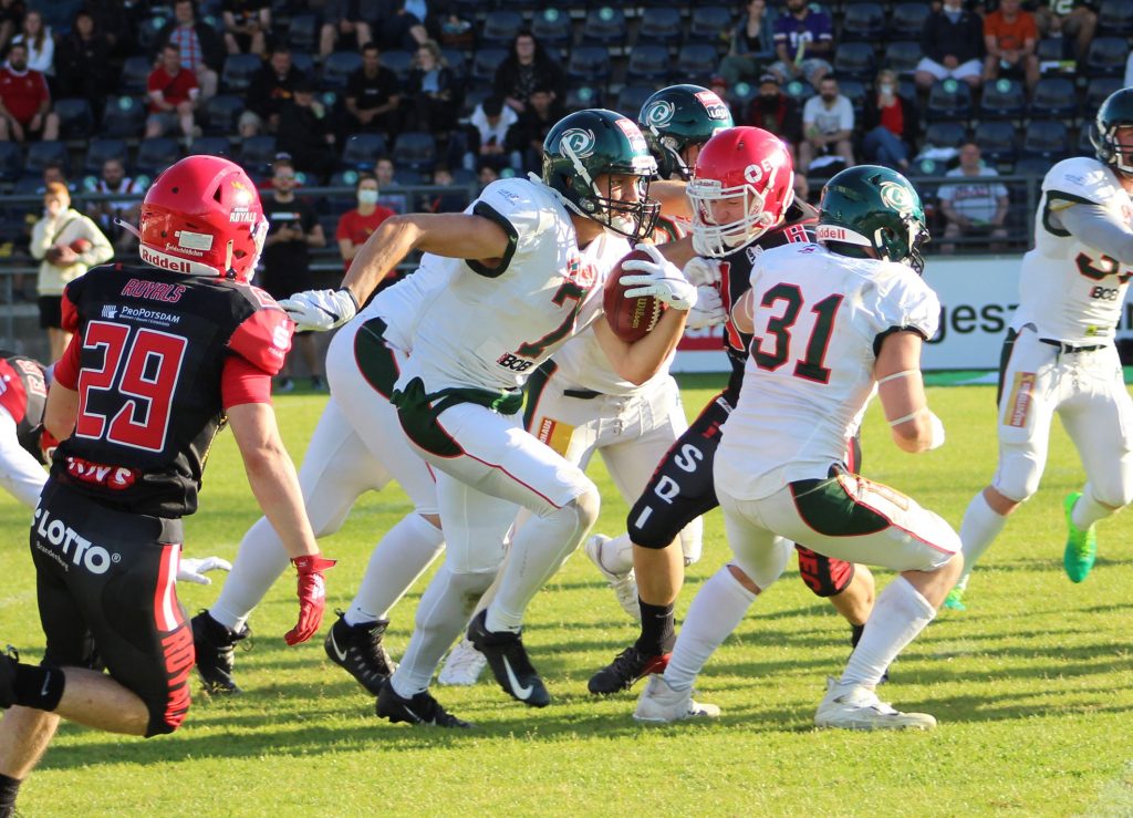 Nach der herben Auftaktniederlage am vergangenen Wochenende gegen die Potsdam Royals wollten die Kiel Baltic Hurricanes beim Rückspiel am Samstagnachmittag im Potsdamer Karl-Liebknecht-Stadion neu angreifen. Am Ende fiel das Ergebnis mit 52:6 (23:0/8:0/14:0/7:6) für die Gastgeber jedoch ähnlich aus. Zusätzlich mussten die Hurricanes weitere Verletzungen sowie die Hinausstellung ihres Spielmachers Joe Germinerio, dem unsportliches Verhalten […]