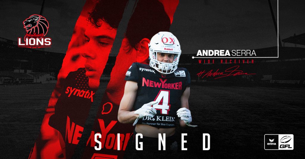 Im Rahmen der Spielpause vor dem Spiel gegen die Potsdam Royals am vergangenen Wochenende, erhielt auch die Wide Receiver Crew der New Yorker Lions nochmals Verstärkung. Mit dem erst 20-jährigen Andrea Serra, stieß der beste Ballfänger der Giaguari Torino der Saison 2022 zu den Löwen. In insgesamt sechs Spielen der regulären Saison für die Turiner, […]