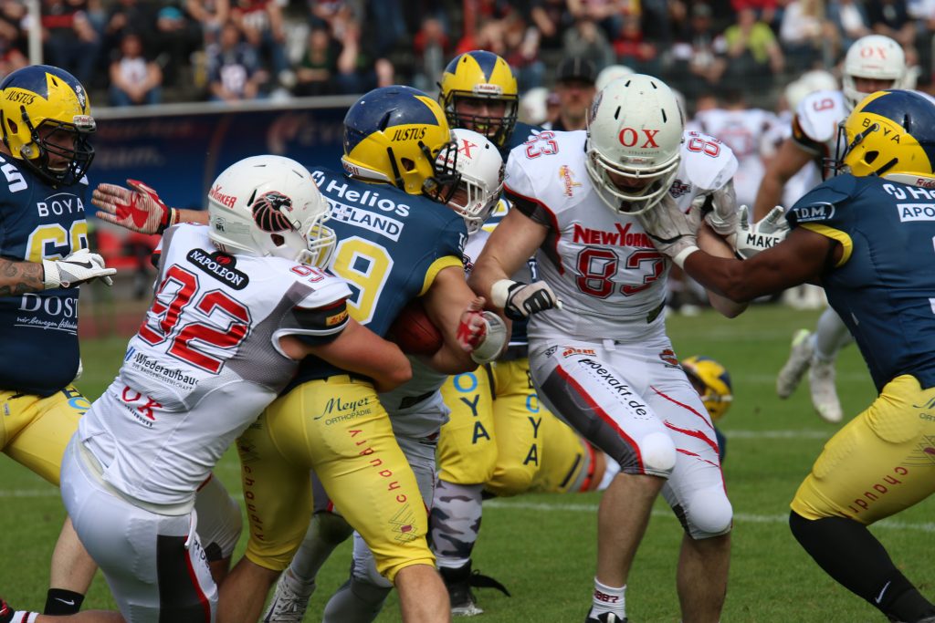 Knapp 2.700 Fans sahen bei hochsommerlichen Temperaturen im Braunschweiger Eintracht-Stadion einen erneuten deutlichen 39:0 (13:0; 10:0; 7:0; 9:0) Sieg der New Yorker Lions, die damit bereits zum dritten Mal in dieser Spielzeit, ihren Gegner ohne eigene Punkte vom Platz schickten. Das Resultat der Partie hätte dabei sogar noch wesentlich deutlicher Ausfallen können, hätten da nicht […]