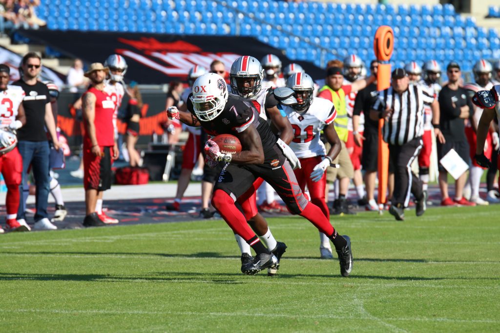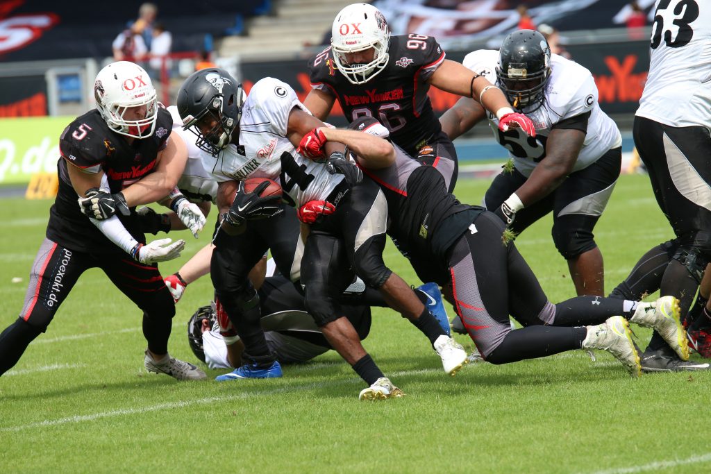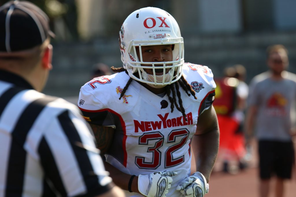 Siegreich kehrt das Team der New Yorker Lions von ihrer GFL Premiere im potsdamer Sportpark im Luftschiffhafen zurück. In der Hitzeschlacht gegen die Potsdam Royals stand es zum Ende der Partie 13:41 (10:14; 0:14; 3:7; 0:6) aus Sicht der Gastgeber. Zwei Touchdowns beim klaren Sieg der Lions steuerte bei seinem Debut Runningback Christopher McClendon bei, […]