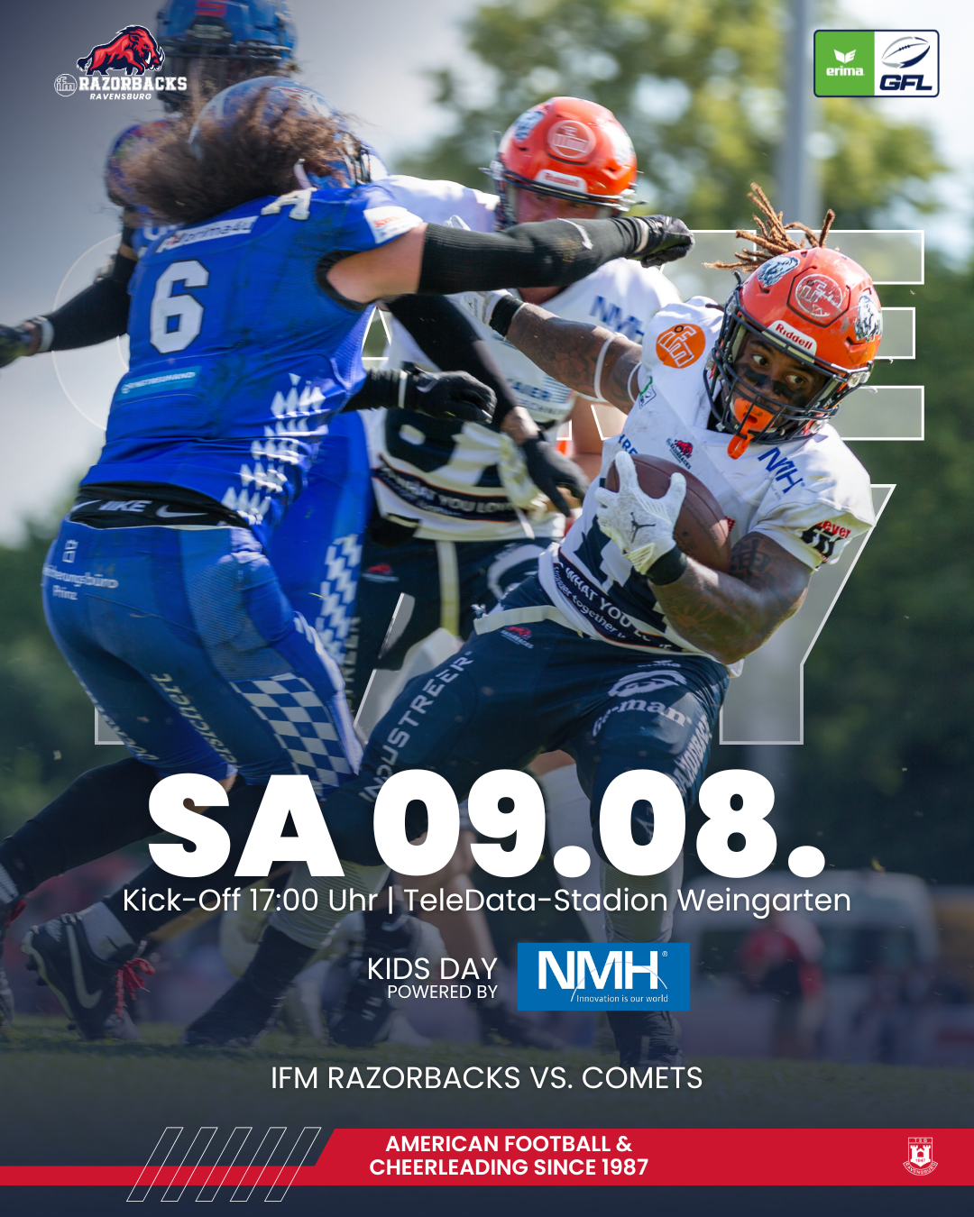 Am kommenden Samstag um 17:00 Uhr ist es wieder so weit: Im TeleData Stadion am Lindenhof steigt eines der emotionalsten und traditionsreichsten Duelle der GFL Süd – das Lokalderby zwischen den ifm Razorbacks Ravensburg und den Allgäu Comets aus Kempten. Wenn Oberschwaben auf das Allgäu trifft, liegt Spannung in der Luft – und genau das erwartet die Fans an diesem Wochenende in Ravensburg.
