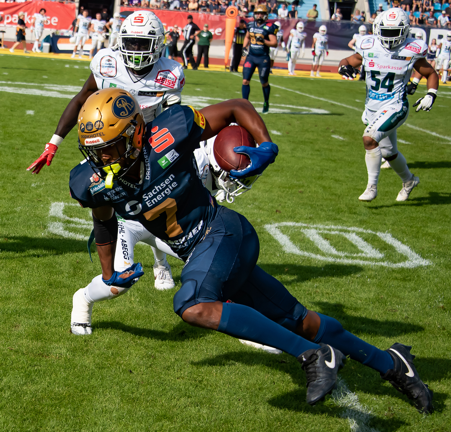 Nur einer von zwei Touchdowns, den die deutlich stabilere Monarchs-Defense in diesem Spiel zuließ. Der zweite fiel 57 Sekunden vor Schluss durch Austin Brock. Der dritte Touchdown durch Defense End Kerim Altunbas (24.) zwei Sekunden vor dem Pausentee war das Produkt eines Fumbles von Dresdens Quarterback Justin Miller. Vielleicht der einzige Fehler, den die Monarchs-Offense an diesem Tag machte. Der Motor von Tofunmi Lala lief mal wieder auf Hochtouren, auf Touchdown Nummer eins folgten noch zwei weitere (16./27.). Auch Tyler Hudson, zweimal (18./39.) perfekt von Miller bedient, und Joel Särkelä (35.) rundeten eine richtig starke Mannschaftsleistung beim SachsenEnergie Gameday ab.