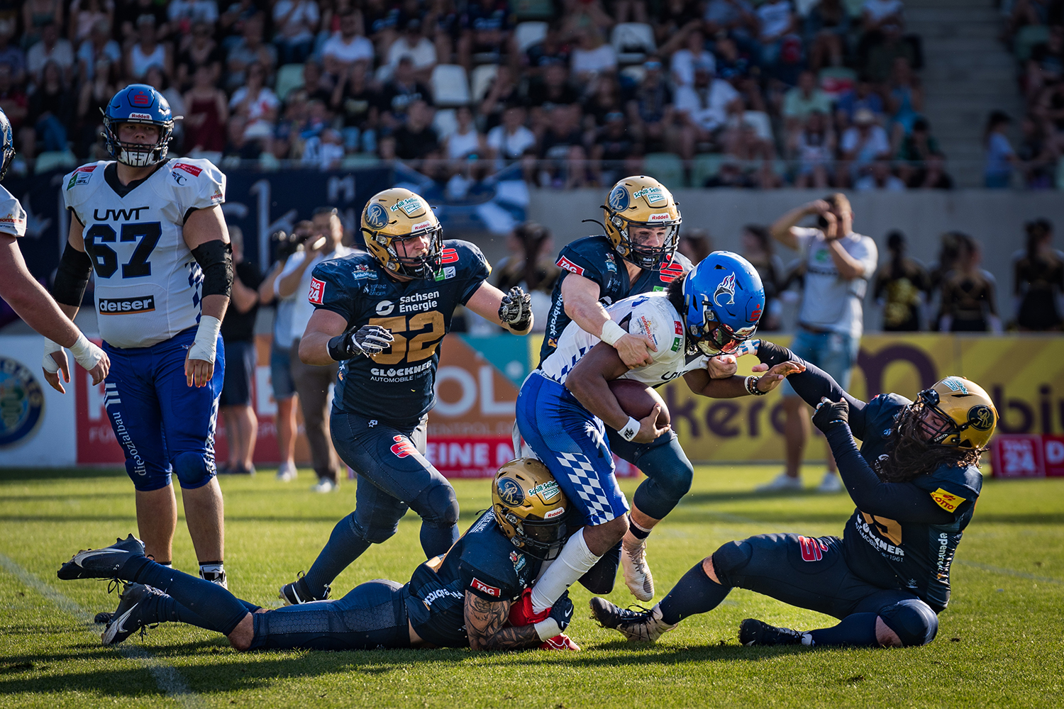 Was für eine wilde Woche – welch Reaktion darauf! Erst verliert Dresden am vergangenen Wochenende überraschend bei den Berlin Rebels und verliert dabei auf Grund eines Platzverweises den Stamm-Spielmacher und einen seiner Lieblings-Receiver. Dann wird Ersatz geholt, der natürlich eigentlich nur genau das ist: ein Ersatz. Dann schlagen die schon erwähnten Rebels am Samstag auch noch Dresdens direkten Konkurrenten Hildesheim und sorgen damit für etwas weniger Puls in Dresden. Und dann, ja dann legt Ersatzmann Karé Lyles zusammen mit seinem Team vor 10.000 frenetisch feiernden Fans eine unglaubliche Show auf den nigelnagelneuen Rasen. Die passende Show zum lang ersehnten ersten Heimspiel im geliebten Heinz-Field nach gut drei Jahren. Ein perfektes Spiel für erwartungsvolle Fans, die zu tausenden kamen und Bock auf eine ausgelassene Party hatten.