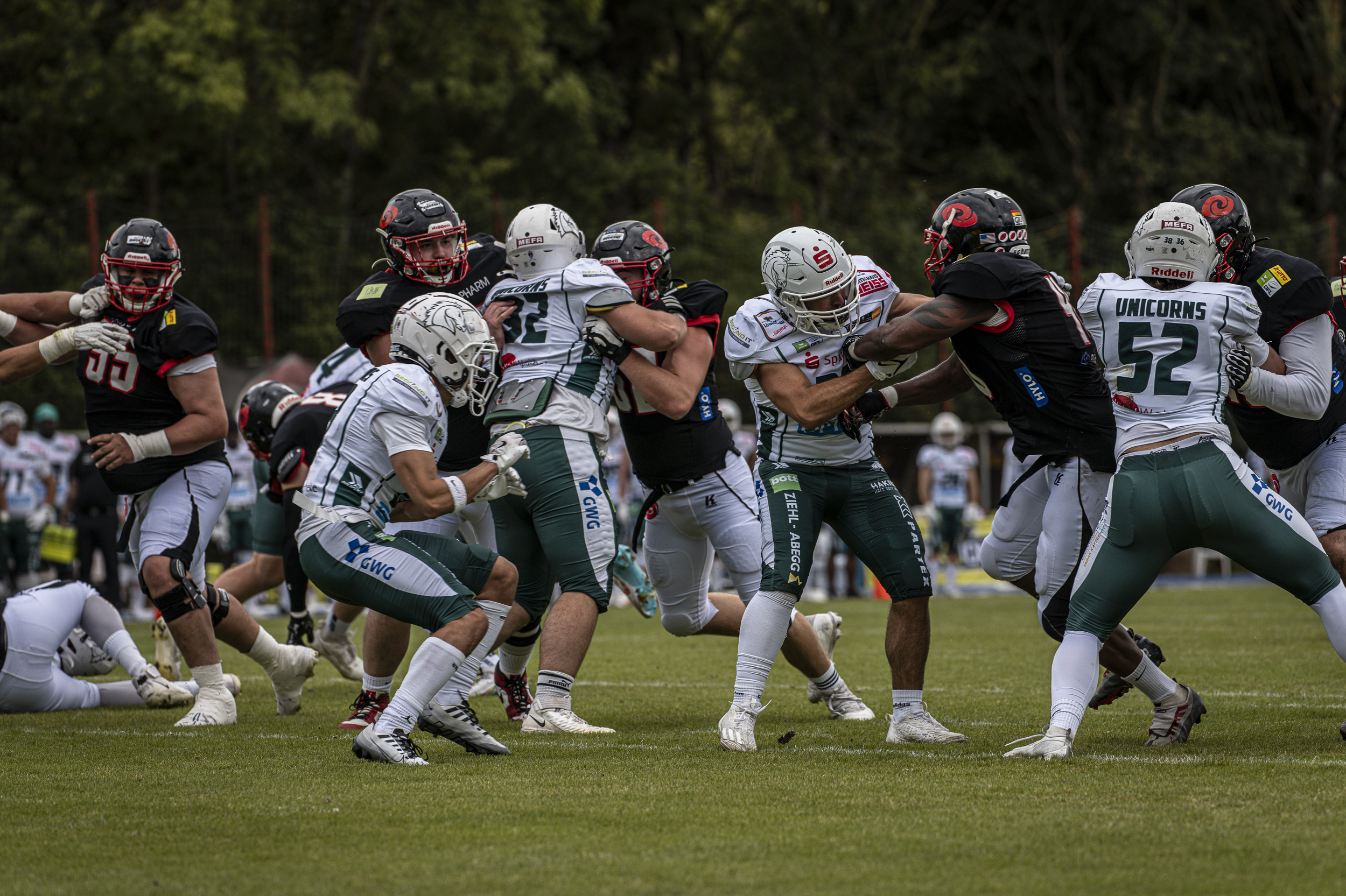 Direkt nach der Halbzeit kippte das Spiel. Ein Kickoff-Return über das gesamte Feld brachte Hall zurück ins Spiel, und ein erzwungenes Fumble sorgte wenig später sogar für den Ausgleich. Die Unicorns nutzten in dieser Phase jeden Fehler gnadenlos aus, während die Hurricanes – ähnlich wie schon im Hinspiel im Juni – gegen Ende ins Straucheln gerieten.