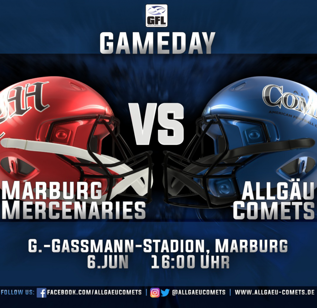 Am 25.08.2019 waren die Allgäu Comets beim letzten GFL Heimspiel der Marburg Mercenaries zu Gast. Und die Spielplanung will es, das am Sonntag, den 6. Juni 2021 ebenfalls wieder das Team aus dem Allgäu in Marburg zum GFL Auftakt nach dieser langen Corona Pause antritt. Damals konnten die Mercenaries das Spiel 36:15 gewinnen, nachdem sie […]