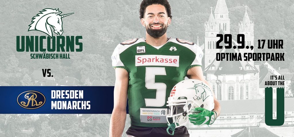 Zum letzten Heimspiel in dieser Saison empfangen die Schwäbisch Hall Unicorns zum AVS-Gameday am Samstag um 17:00 Uhr die Dresden Monarchs im OPTIMA Sportpark. Es handelt sich dabei um nichts geringeres als das Halbfinale um die Deutsche Footballmeisterschaft 2018! Mit einem Sieg ziehen die Haller zum siebten Mal in den German Bowl ein, für Dresden […]