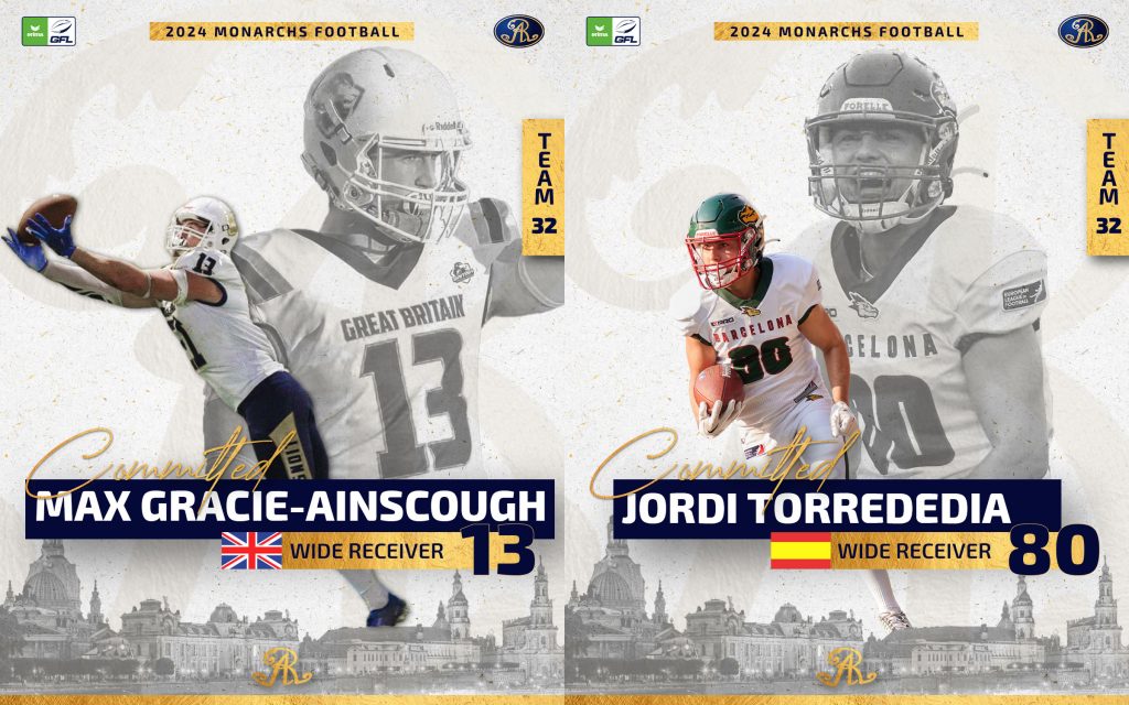Zwei europäische Widereceiver verstärken die Offensive Der Bundesligakader der Dresden Monarchs nimmt weiter Form an. Nach dem amerikanischen Defense Liner Michael Badejo verpflichten die Königlichen nun zwei weitere internationale Verstärkungen – dieses Mal aus Europa. Mit dem Spanier Jordi Torrededia und dem Briten Max Gracie Ainscough stoßen gleich zwei Passempfänger zum Team von Cheftrainer Greg […]