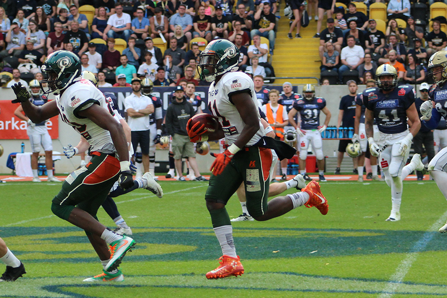 Kiel, 10.06.1017 – Mit 49:42 (0:21/21:7/21:0/7:14) gewannen die Kiel Baltic Hurricanes einen wahren Footballkrimi gegen die Dresden Monarchs. Nach einem starken Start der Gastgeber sahen sich die Canes vor den 7.200 Zuschauern im Dresdner DDV-Stadion schnell einem 0:21 Rückstand gegenüber. Doch das Team kam zurück, schaffte mit dem ersten Spielzug der zweiten Halbzeit den Ausgleich und ging anschließend in Führung. Zum Ende kamen die Monarchs wieder ran und so hielt es in den letzten Sekunden niemanden im Stadion mehr auf den Sitzen. Doch die Hurricanes konnten den finalen Angriff der Dresdner abwehren und sich den ersten Sieg der Kieler in Dresden seit 2012 sichern.