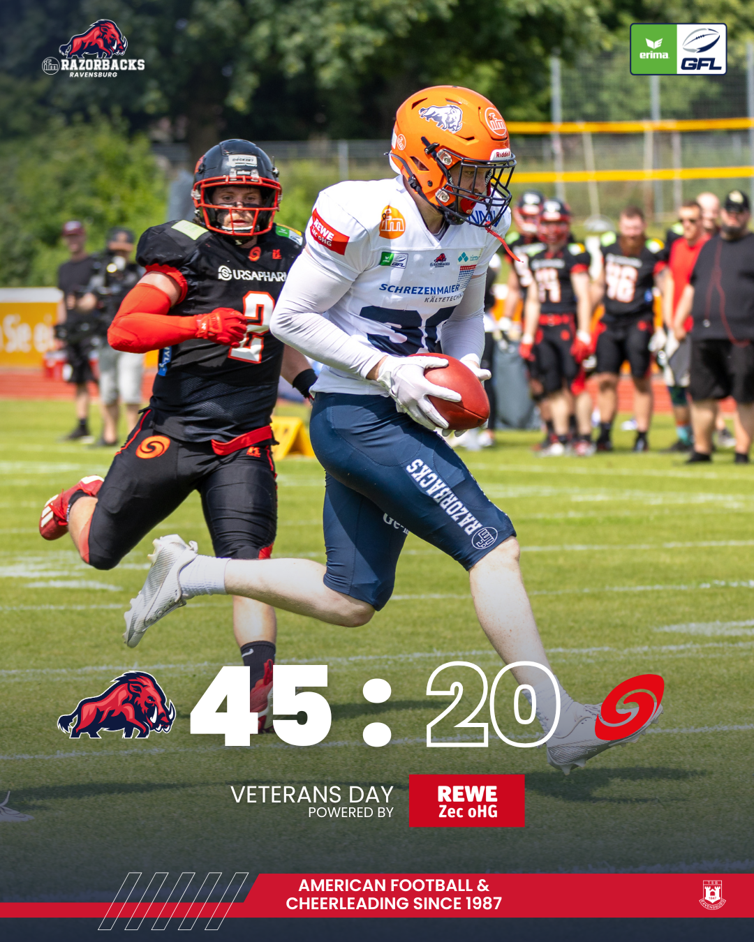 In einem eindrucksvollen Auftritt vor heimischem Publikum setzten sich die ifm Razorbacks Ravensburg am Sonntag mit 45:20 gegen die Saarland Hurricanes durch.