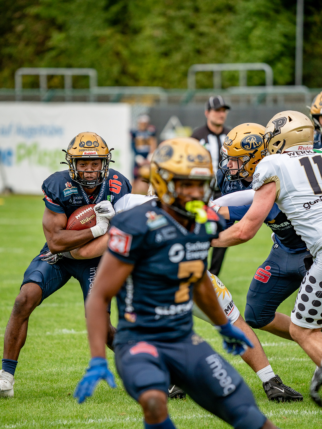 Pflichtaufgabe erfüllt! Klar waren die Monarchs als bisher ungeschlagener Tabellenführer beim Tabellen-Letzten von vornherein der klare Favorit. Aber spielen, Punkte machen und gewinnen muss man schon noch. Und Paderborn hielt, vor allem im ersten Durchgang, ordentlich gegen. Die ersten Minuten gehörten dann auch eindeutig den Gastgebern. Dresdens Verteidigung war nach der langen Busfahrt augenscheinlich noch müde. Zu einfach konnte sich Paderborn, angeführt von Spielmacher Niklas Gorny, übers Feld bewegen. Pass, Lauf, egal. Recht schnell stand man vor der Monarchs Endzone. Und konnte die erste Führung bejubeln! Gorny auf Jordan Pouncy zum Touchdown inklusive Zusatzpunkt – 7:0. Das ging fix. Dresden war fixer! Drei Spielzüge, ein Lauf, zwei Pässe. Und schon stand es 7:7! Tylor Hudson fing an der Mittellinie einen Pass von Dresdens Quarterback Justin Miller, schüttelte zwei Verteidiger ab und lief unbedrängt in die Endzone (PAT Florian Finke). Im zweiten Dolphins-Drive war die Verteidigung der Monarchs dann wach. Kein Raumgewinn, erneut Dresden im Angriff. Und statt drei Spielzügen reichte diesmal einer! Miller Pass auf Konstantin Stricker: Touchdown Nummer Zwei (PAT Finke 7:14)! Dann war es Zeit für ein Gastgeschenk. Dresdens Returner AJ Jackson unterschätzte einen Paderborner Punt und gab so den Dolphins eine neue Chance kurz vor der Monarchs-Endzone. Die sagten artig Danke, schickten Runningback Joshua Breece und der tanzte sich in die Endzone. Und um den Monarchs nach diesem Fehler so richtig weh zu tun, setzte Paderborn gleich noch auf zwei Zusatzpunkte. Gorny auf Pouncy und die Dolphins lagen Ende des ersten Viertels mit 15:14 vorn. Konnte Dresden so nicht stehen lassen. Die Sachsen schalteten zwei Gänge höher und fingen an zu dominieren. Allein drei Touchdowns setzte es in Viertel Nummer Zwei. Erst Tylor Hudson, dann Janne Särkelä nach Miller-Pässen. Und kurz vor der Pause zündete Dresdens Runningback Tofunmi Lala den Turbo und sprintete über reichlich 70 Yard zum nächsten Touchdown (PAT alle Finke). Halbzeitstand 15:35!