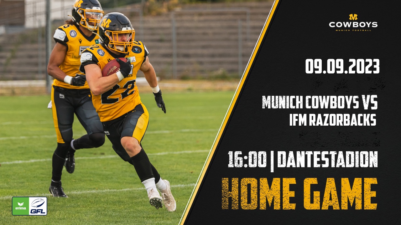 Am kommenden Samstag, 09.09.2023 trifft das Munich Cowboys GFL Team zum entscheidenden Spiel im Münchener Dantestadion auf die ifm Razorbacks Ravensburg. Der Sieger vermeidet die Relegation und wird auch 2024 in der ERIMA German Football League antreten dürfen.