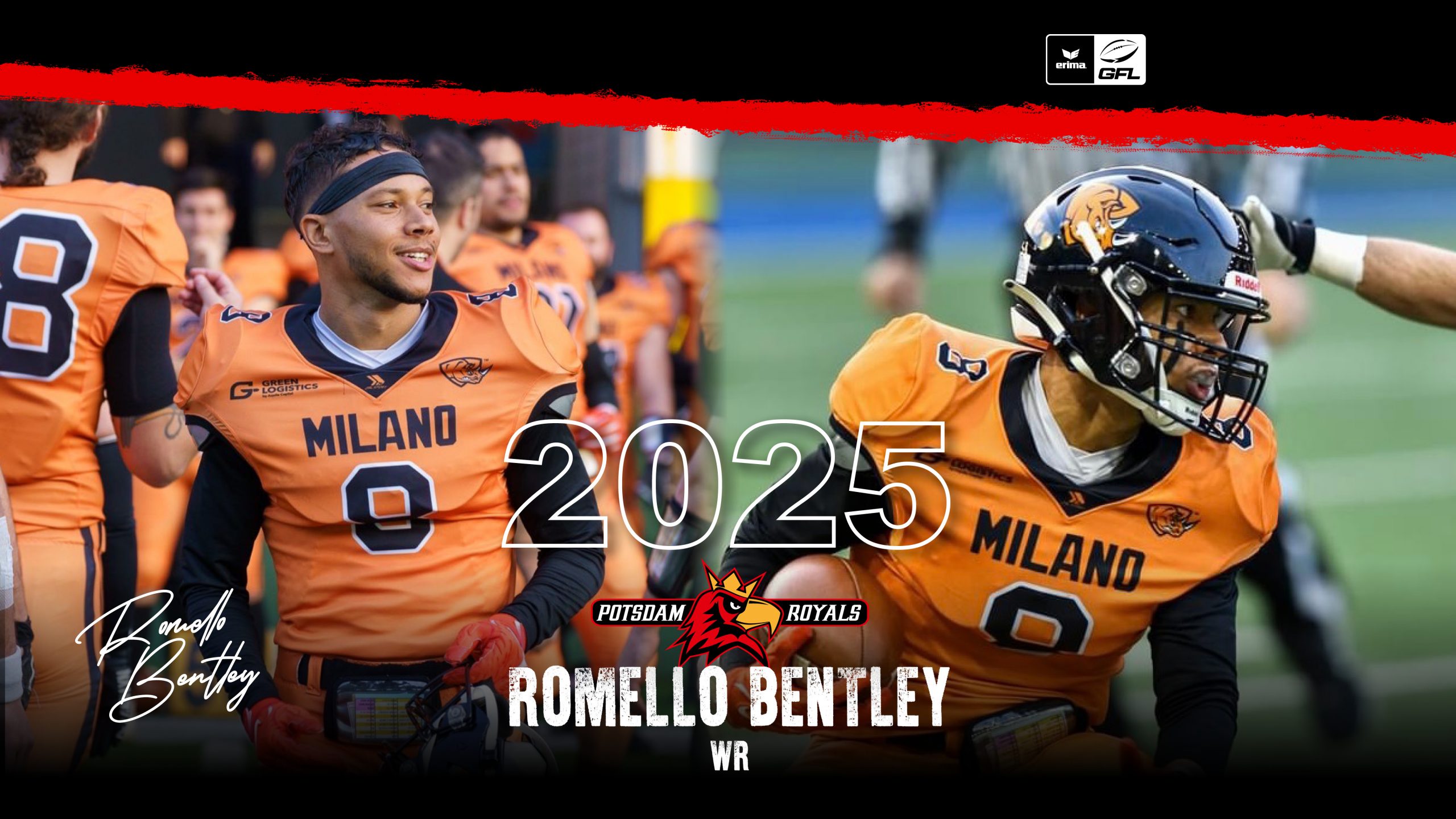 Romello Bentley, All-Conference WR & Returner, bringt Speed & Playmaking nach Potsdam. Nach zwei starken Jahren in Italien bei den Rhinos Milano ist er bereit für die GFL!
