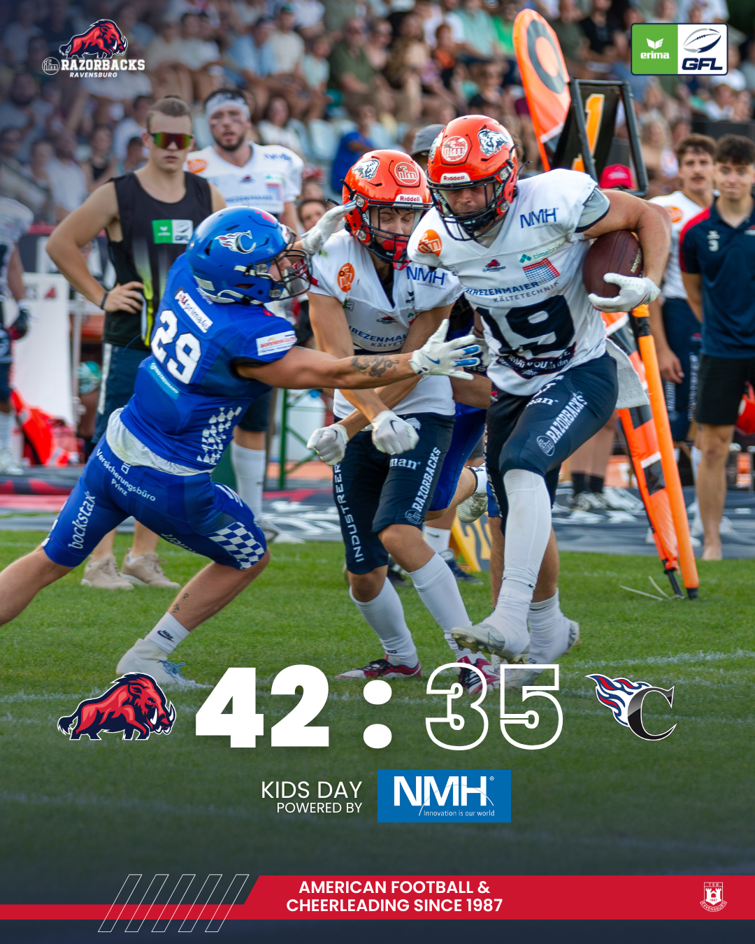 Was für ein Abend im TeleData Stadion Lindenhof! Die ifm Razorbacks Ravensburg haben am Samstag vor 1.214 Fans nicht nur einen Sieg eingefahren, sondern ein Football-Märchen geschrieben, das die Zuschauer noch lange begleiten wird. Im Derby gegen die Allgäu Comets lagen die Oberschwaben bereits hoffnungslos mit 14:35 zurück – um dann im Schlussviertel in einem wahren Sturmlauf 28 Punkte zu erzielen und die Partie mit 42:35 für sich zu entscheiden.