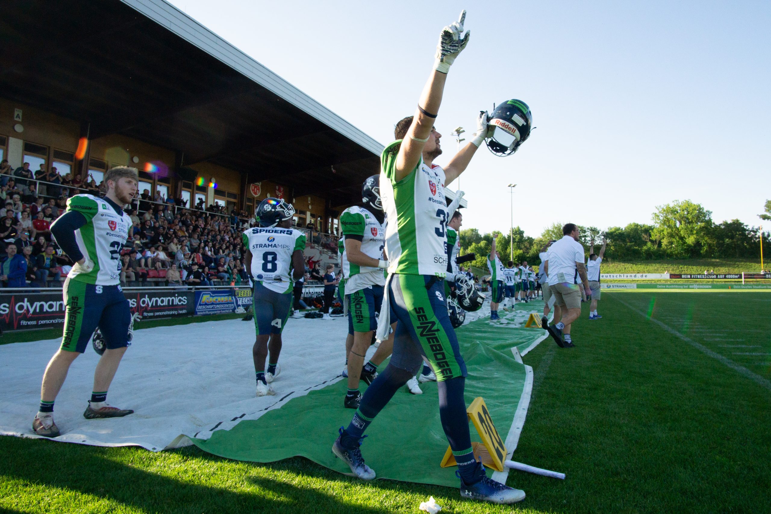 Die Spiders-Defensive hatte einen enormen Goalline-Stand, als die Ravensburger es in drei Versuchen innerhalb von 5 Yards nicht geschafft haben, den Ball über die Linie zu drücken, so blieb es beim Fieldgoal, den einzigen Punkten des Tages für die Oberschwaben. So ist es nur passend, dass das große Finale der Defensive überlassen war – ein verzweifelter Versuch der Razorbacks noch ein Wunder zu kreieren endete mit einem getippten Pass, den sich Luca Aigner schnappte und damit in die Endzone marschierte zum Endstand von 14:3.