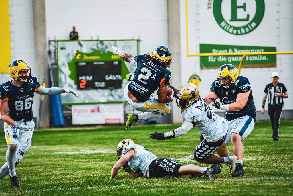 Hildesheim. Es war der erwartete Kampf gegen starke Paderborn Dolphins auf dem Hildesheimer Helios Field. Bis zur Pause blieb es spannend (28:24), dann hatte die Invaders Defense den richtigen Schlüssel gegen die Dolphins und ihren Runningback Joshua Breece gefunden. Am Ende stand es vor 1500 Zuschauern (ausverkauft) 50:31. Die Invaders hatten sich für das erste […]