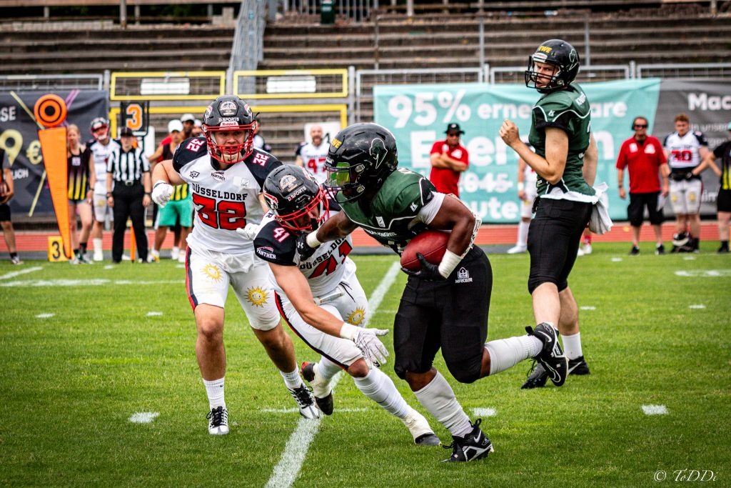 Knapp 1.000 Fans waren bei bestem Sommerwetter ins Oldenburger Marschwegstadion gekommen, um ihre Knights gegen die Düsseldorf Panther spielen zu sehen. Was sie sahen war eine Demonstration des Footballs von den Düsseldorfern, die ihrem Status als haushoher Favorit mehr als gerecht wurden.Die Knights hatten sich hervorragend auf das gefährliche Laufspiel der Panther, speziell auf RB […]
