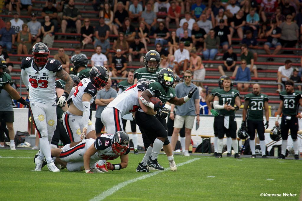 Knapp 1.000 Fans waren bei bestem Sommerwetter ins Oldenburger Marschwegstadion gekommen, um ihre Knights gegen die Düsseldorf Panther spielen zu sehen. Was sie sahen war eine Demonstration des Footballs von den Düsseldorfern, die ihrem Status als haushoher Favorit mehr als gerecht wurden.Die Knights hatten sich hervorragend auf das gefährliche Laufspiel der Panther, speziell auf RB […]