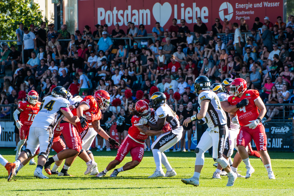 In einer sehr klaren Partie schlugen die Potsdam Royals gestern die aus München angereisten Cowboys mit 72 zu 6. Nach dem Spiel gegen Paderborn haben die Royals nun ihren zweiten sehr dominanten Sieg in Folge eingefahren. Trotz 32 Grad konnten die Potsdamer ein nahezu fehlerfreies Spiel gegen die Gäste aus München abliefern und ihren Fans […]
