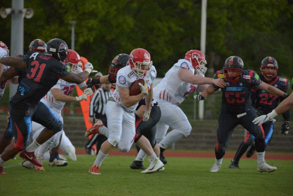 Etabliertes GFL 2 Team gegen Aufsteiger. Was von der Papierform eine klare Angelegenheit zu werden schien, entwickelte sich beim Auswärtsspiel gegen die Troisdorf Jets zu einem harten Stück Arbeit für die Griffins. Personell nicht in Bestbesetzung angereist konnten die Greifen allerdings gleich im ersten Drive punkten. Nach einem langen Pass auf Chiam James war es RB Jermichael Selders, […]