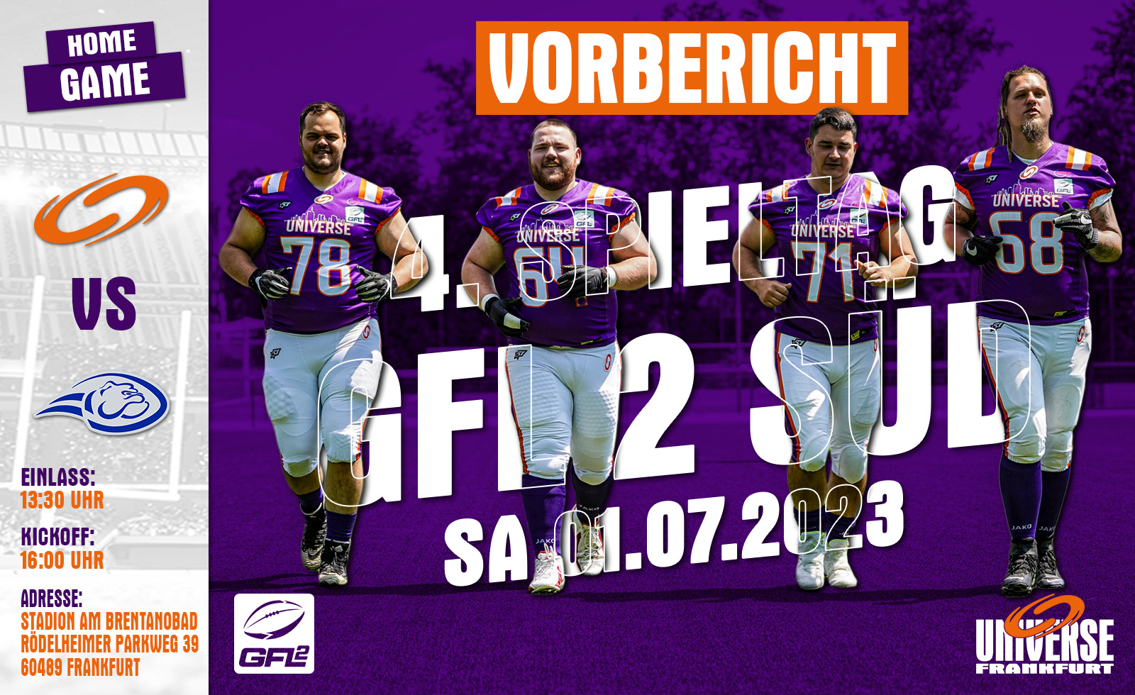 Am kommenden Wochenende erwartet uns ein doppeltes Football-Spektakel mit den Spielen unserer U16-Mannschaft und unserer GFL2-Mannschaft. Am Samstag, den 01.07.2023, kämpfen unsere Herren gegen die Pforzheim Wilddogs um weitere Punkte. Am Sonntag, den 02.07.2023 ab 10 Uhr, empfängt unsere ungeschlagene U16-Mannschaft bei ihrem Heimturnier die ebenso ungeschlagenen Saarland Hurricanes und die Hanau Hornets. Es erwartet uns also ein fantastisches Football-Wochenende im Zeichen von Frankfurt Universe.
